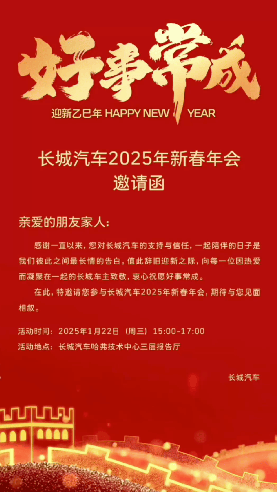 长城汽车2025年新春年会将于1月22日举办,这次年会不只面向长城汽车的职工,还邀请了很多长城汽车车主去参加了。这次长城汽车年会的规划可谓是非常用心,以“功德常成”作为年会主题,的确非常冷艳。一方面祝愿我们新的一年功德连连,相同也是功德长城的谐音,可谓是构思满满。更值得一提的是,据相关音讯显现,在此次年会上,长城汽车董事长魏建军即将拿出40亿元来奖赏长城汽车的职工。对待职工浸透十足的诚心,这样的做法在车企中的确不多见,我信任能善待职工的老版,对待用户也会更真实。